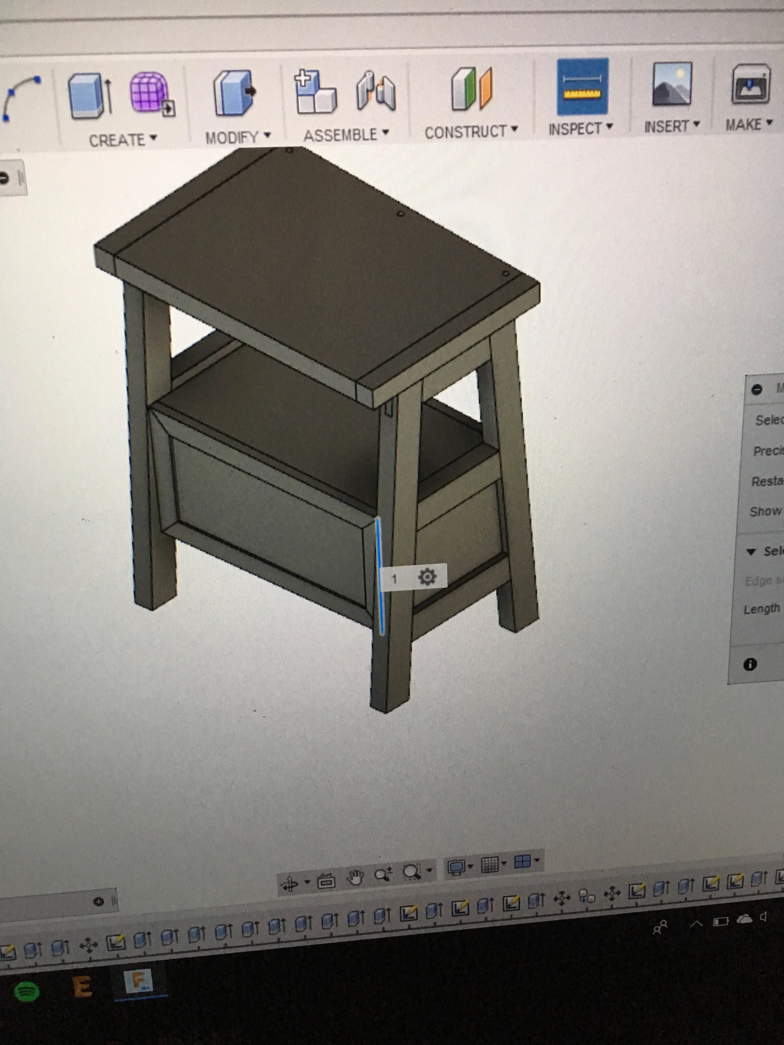 A miter joint would not be a woodworker’s first choice for a load-bearing shelf. These joints have much more surface area than a conventional 90˙ joint, but the slip plane poses a major problem since the wood fibers don’t need to fail for the piece to come crumbling down. If this furniture piece were for a client I would engineer it to sustain this design change, but because it was for me, I wanted to take a chance. I reinforced the joint with a biscuit to provide additional support but I chose fragility because I saw a chance to learn whether it stood or fell. After I practiced some 5th grade mental geometry and spent more time than I’d like to admit cutting angles on the miter saw, I found an angle and clamping mechanism I was satisfied with, and I glued the legs in the little time I had before the temperature dropped.