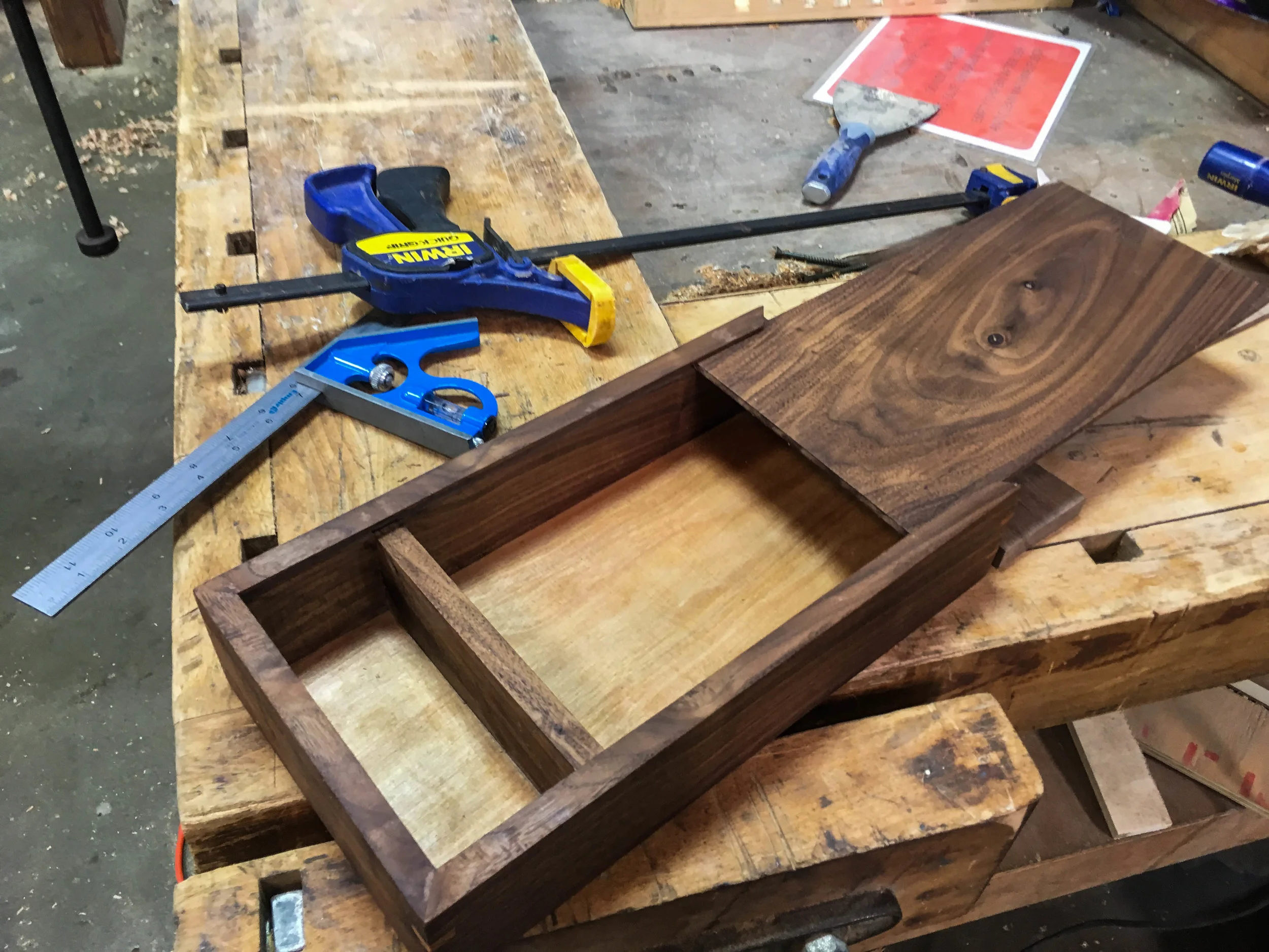 A careful glue-up in the guest room with screws used instead of clamps (shoutout to my parents for tolerating me). I had some concerns surrounding the squareness of the entire enclosure, so I used screws to seat the shelves in the columns and provide extra sheer strength.