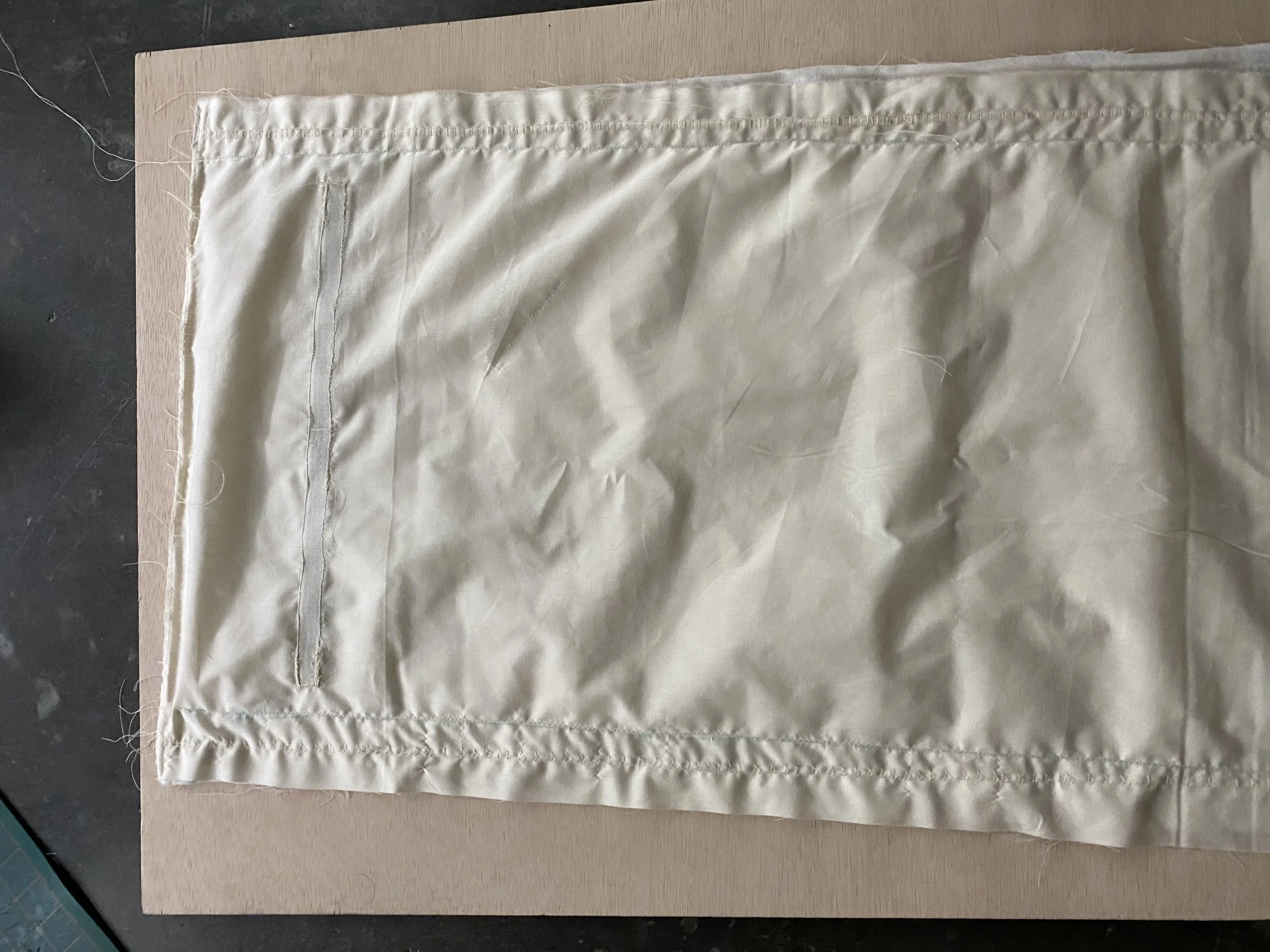 I cut the rings off of a 3-tiered dessert tray and welded rods and stabilizing bars together to complete the frame. I repeated the process to create the second metal frame and I ripped particle board to the appropriate length and width to begin assembly. I drilled holes through the metal and wood and attached the two structures with Chicago screw-rivets. This saved me from having to tap into the steel and simplified assembly. Once the board was mounted I placed the light source and dimmable power-supply on the wood, all that was left was the cover. After determining that one layer of canvas was insufficient to diffuse the light-strip but two layers was too much, I lined a piece of cotton with the canvas and sewed the fabric together, leaving space for the velcro strip I would use to affix the shade to the frame.